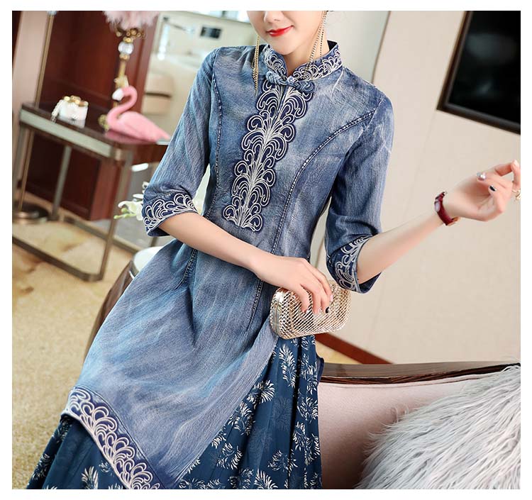 アオザイ風のデニム生地ワンピース。刺繍入り。七分袖。